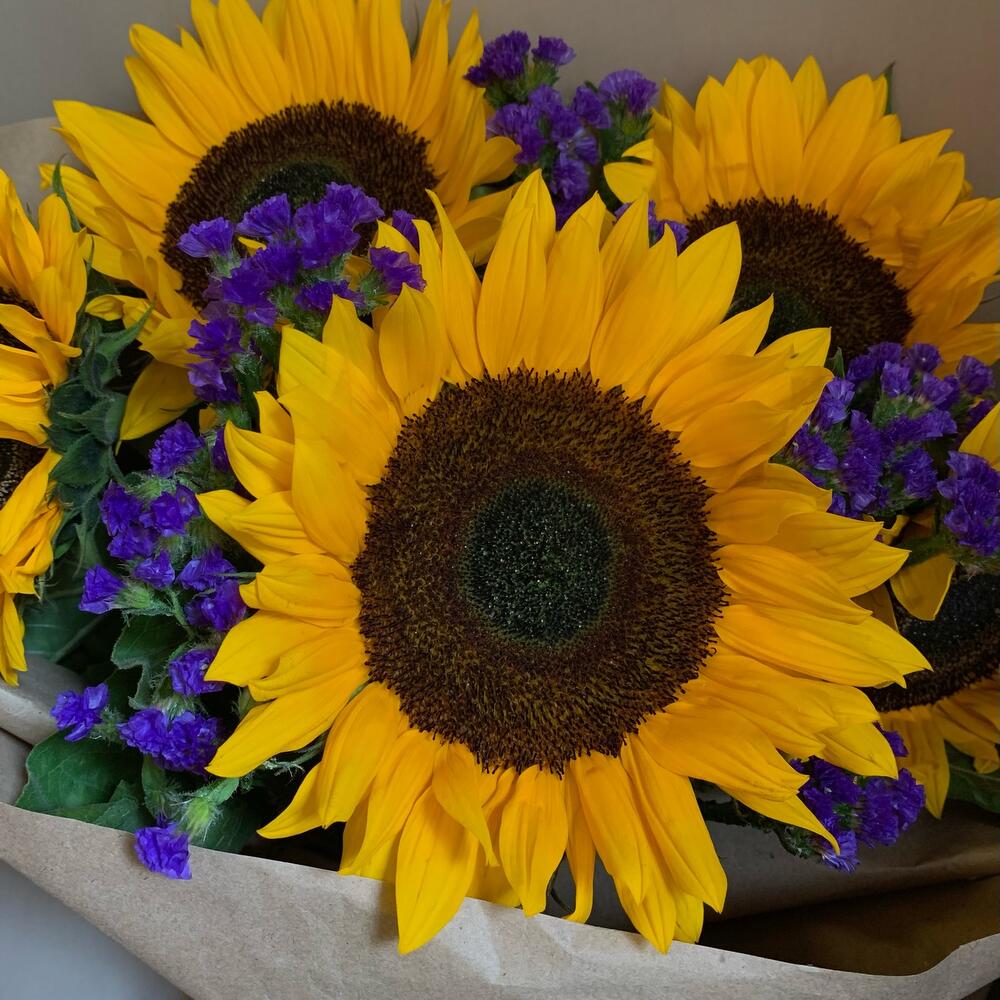 Подсолнух - 5 шт. Статица - 3 шт. Крафт упаковка - 1 шт. Лента атласная - 1 шт.