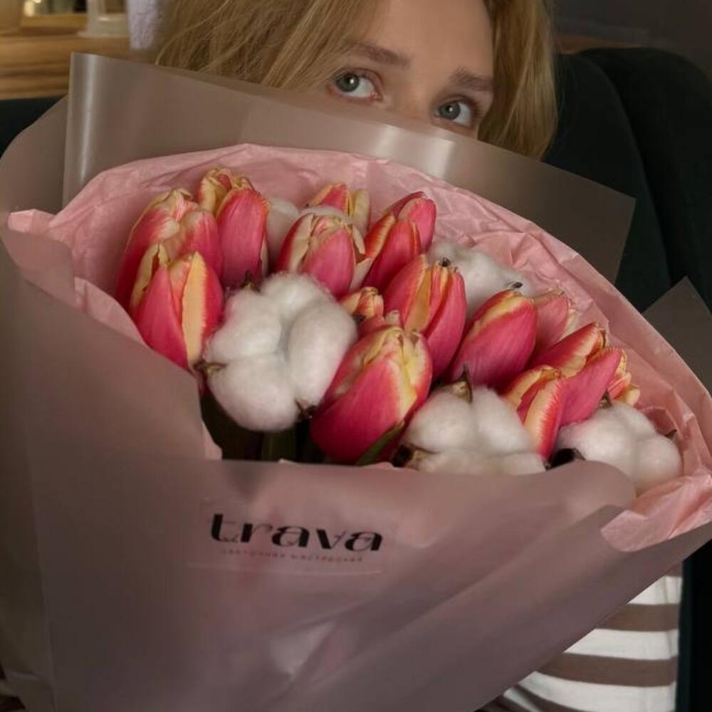 Букет девушке 15 тюльпанов на 8 марта с хлопком в Теберде